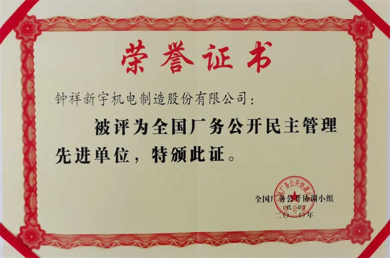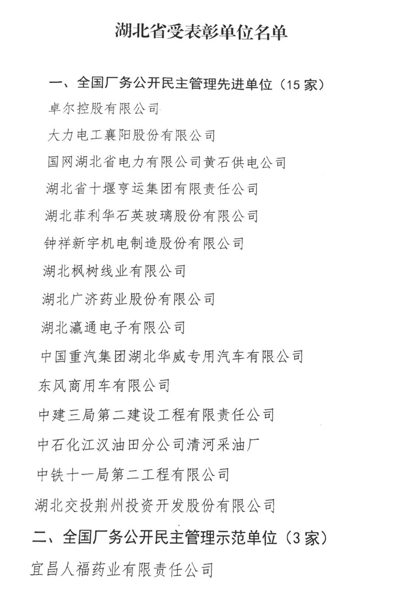 全国厂务公开民主管理先进单位每三年表彰一次,湖北省今年共计有15家企业荣获该荣誉称号,钟祥太阳成集团tyc122cc入口机电制造股份有限公司作为 湖北省唯一的一家中小型民营制造企业榜上有名。