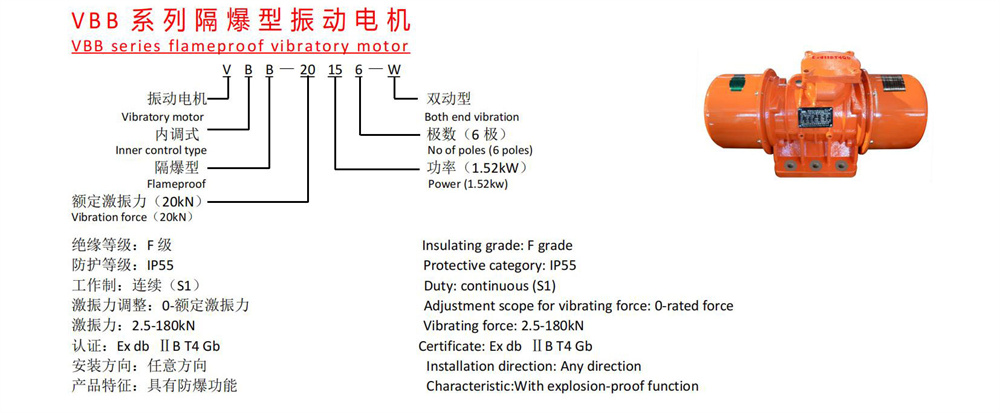 VBB系列隔爆型振动电机,功率0.2~13KW,2、4、6、8极,激振力为3~180KN,共计25个规格。